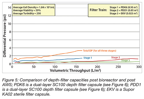 Finally, the required depth filter capacity following AWS clarification was evaluated for a mAb cell culture bioprocess fluid. As can be seen in Figure 5, the depth-filter capacity was enhanced more than four-fold compared with that required directly post bioreactor (data not shown). Specifically, the filter area was reduced from 0.55 m2 to 0.15m2.