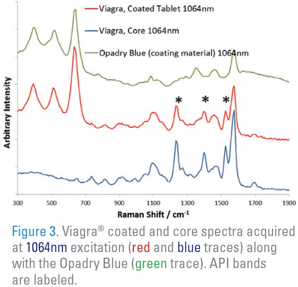 Fluorescence interference is a challenge in detecting counterfeit drugs with handheld Raman analyzers using 785nm laser excitation sources. With a higher excitation wavelength generated by the handheld Rigaku ProgenyTM 1064nm analyzer, signal blocking fluorescence is minimized. To demonstrate the advantages of the use of a 1064nm analyzer, samples were analyzed with 1064nm and 785nm spectrometers (Figures 1-3). In all cases, excitation at 785nm yielded a strong fluorescence background precluding comparison of authentic and counterfeit products. In contrast, 1064nm spectra produced compound specific “signature” Raman peaks used to clearly distinguish between authentic and counterfeit products. Figure 3 shows a comparison of spectra obtained from a coated tablet with those from the core of tablet. It is clear that the 1064nm excitation Raman analyzer can measure the tablet through the coating and see peaks that are specific to the API.